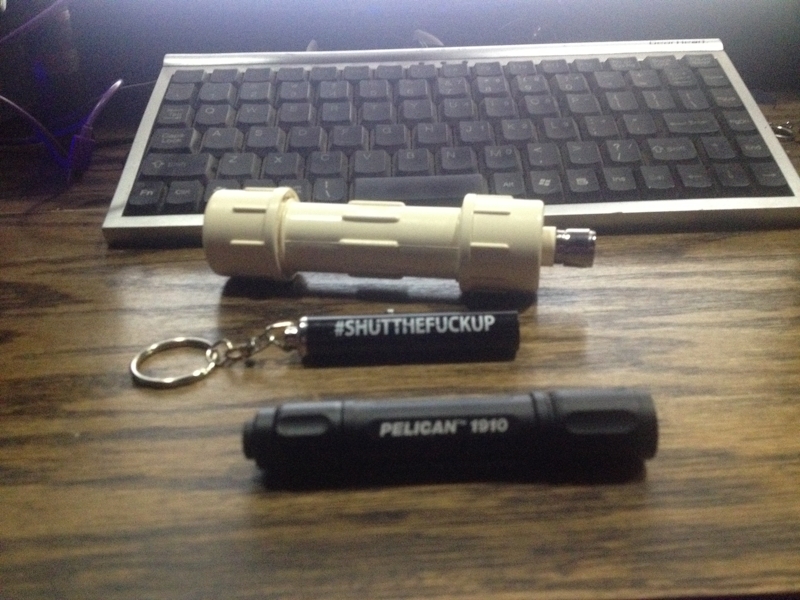 It's a little LED keychain with a lens that projects "#SHUT THE FUCK